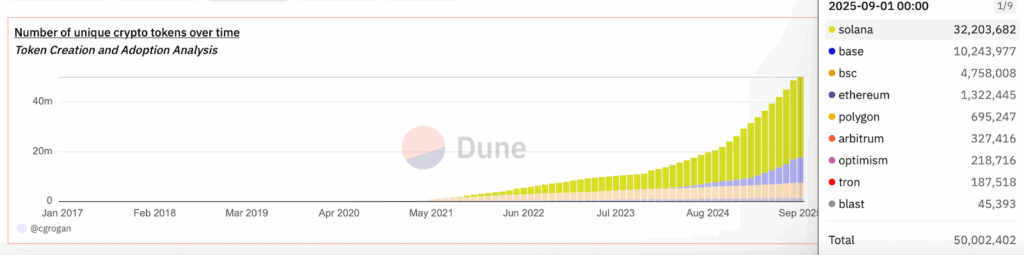 The number of cryptocurrencies varies per blockchain and network, and from the roughly 50 million tokens currently available, 32 million have been launched on the Solana network. Other blockchains, such as Base or Binance Smart Chain, are also part of the top 3.